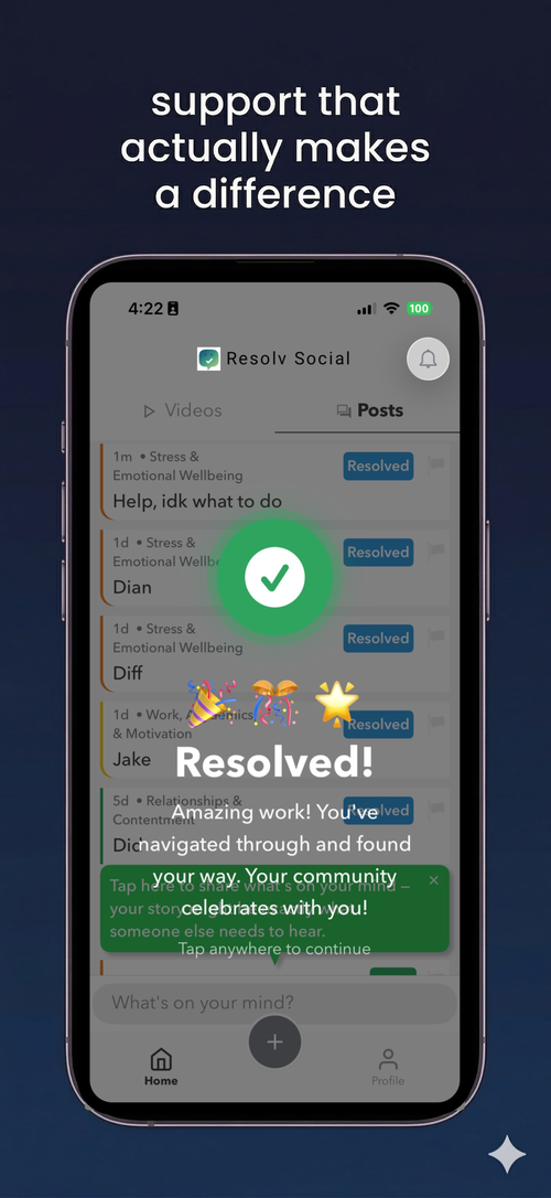 — Anonymous, anxiety“I can't afford therapy. Resolv gave me a community that actually listens and helps me work through things — not just vent into the void.”